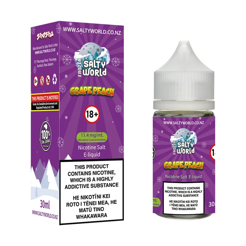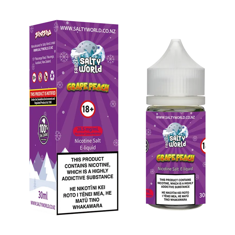Previously known as Frozen World Grape Peach Ice Nicotine Salt E-Liquid.